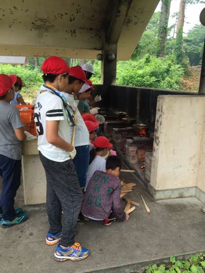 かまに火をおこし、煮込めば出来上がり・・・・おっと、火加減(薪のくべ方)も気を付けてね。もうすぐ美味しいカレーライスが出来上がります。