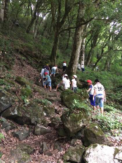5年生は近くにある「八反の滝」へ行きました。はるか上から流れ落ちる滝に見入りながら、川岸で、足首のあたりまで川の水につけたりしていました。一番右の写真は滝からの帰り道。すごく急な坂道を一歩づつ踏みしめながら登っていました。