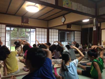 5年生みんなが集まると、部屋の中は込み合います。それでラジオ体操は座って行いました。