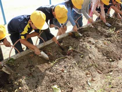 学習園で育てていたサツマイモを2年生の子どもたちが収穫しました。大きくなったサツマイモを見て、歓声をあげていました。