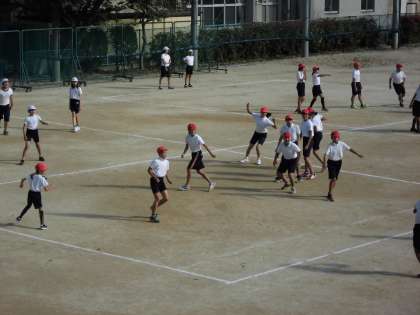 今日は、児童会主催の「なかよしドッジボール大会」です。2学年を4チームに分けてリーグ戦を行います。ドッジボールを通して友だちと交流を深めました。