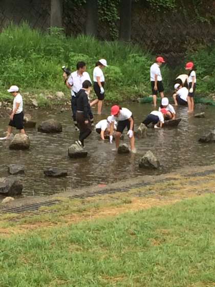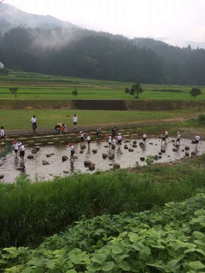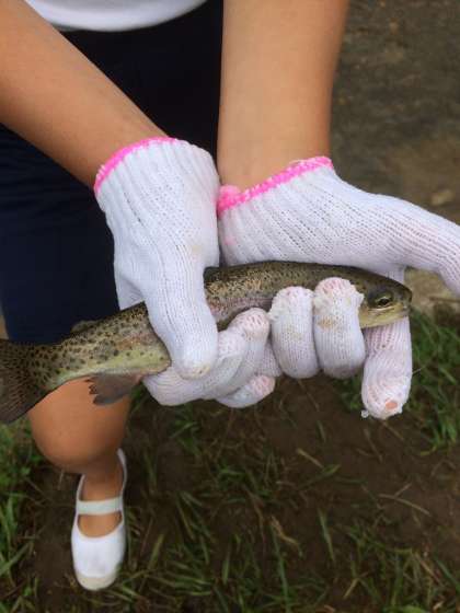 宿舎について、魚つかみへ! 逃げる魚(ニジマス)を夢中になってつかまえます。