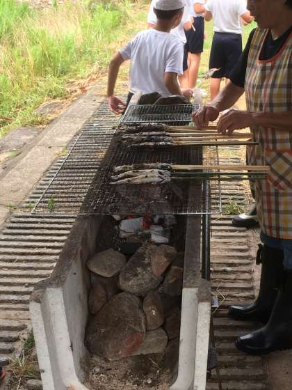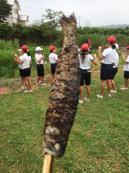 自分たちが捕まえたニジマスをその場で焼いて、かぶりつきます。おいしい!
