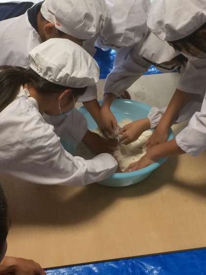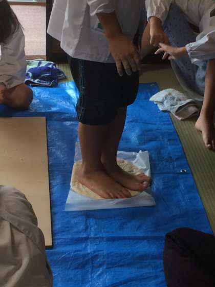 うどん作りの職人になってうどんを作ります。手でこね、足でふみ、棒でのばします。