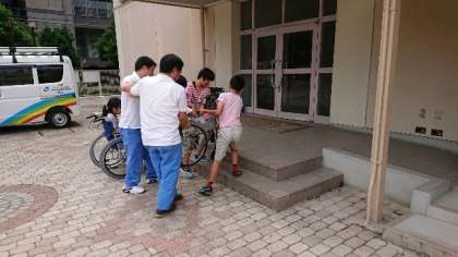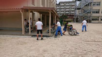 今日は、大阪市立心身障がい者リハビリテーションセンターの方を講師に招き、5年生が、「車いす体験」の学習をしました。お話とともに、実際に車いすに乗ったり、車いすを体験する時間があり、子ども達は「乗った時の感覚」や、車いすを押す側になったら、どうしたら「乗っている人が安心できる」かを、一人ひとり実際に体感しながら学習をしていました。