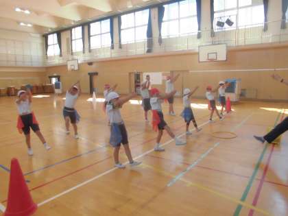 準備運動で「西中エクササイズ」を踊った後、「シナプソロジー」を行いました。「シナプソロジー」は、言葉と動きを結び付けながらどんどん複雑にしていき、脳と体を育てていきます。