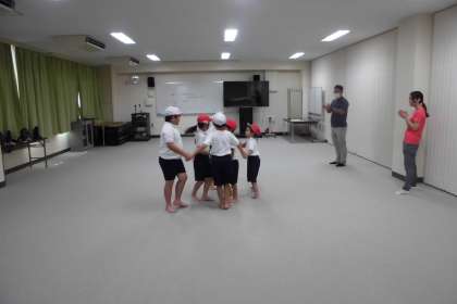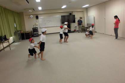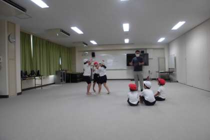 めあては、「体全体を使って物語をつくろう」という事で、二人ペアになって考えたり、みんなで考えたりしました。考えた後は発表して見ていた人は、どんな物語だったかなぁと考えたりなど、友達と楽しく体を動かしました。