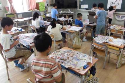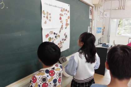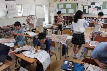 スーパーマーケットの仕事を調べることで、地域に見られる販売の仕事について学習しています。今日はスーパーのチラシから産地の分布を調べました。子どもたちは意欲的にチラシを切っては前の白地図に張りにきて、「北海道に多いなぁ!」「海外のはどうしよー」等気づいたことを交流していました。