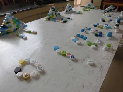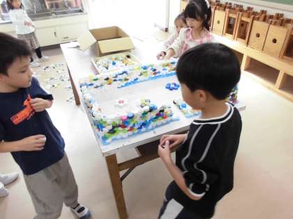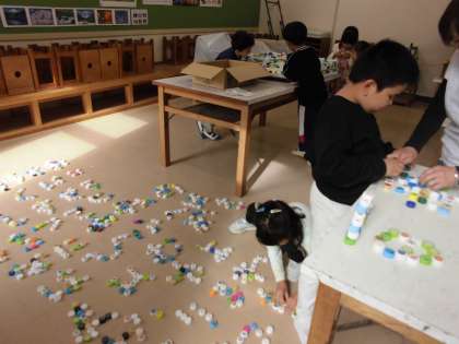 1、2年生がペットボトルキャップを使って造形遊びに取り組んでいました。手の感覚を働かせ、表したいことを工夫して楽しみながら創っていました。子どもたち一人ひとりの発想が表れていて、面白い作品がたくさん出来ました。