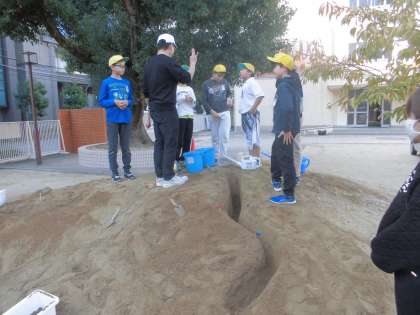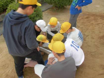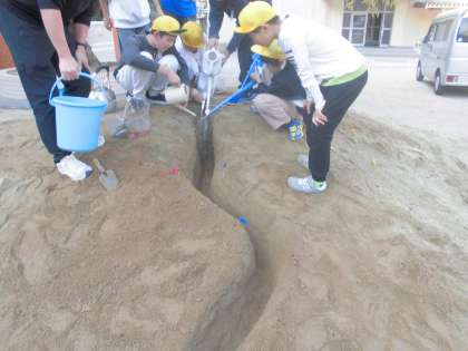 校庭の築山に、実験用の川をつくり、上から水を流しました。