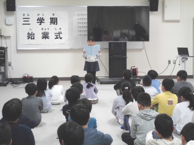 3学期始業式を行いました。校長先生からは、今年の干支についてのお話や、漢字1文字に表した今年の目標についてのお話がありました。児童代表の言葉では、「漢検や九九をがんばって立派な3年生になりたい。」と堂々と発表することができました。