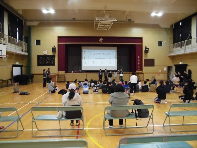 はじめに、健康運動委員会の児童の発表があり、今年度から取り組んでいる今月のポーズをスライドショーにまとめて、理学療法士の方や保護者の方に発表をしました。