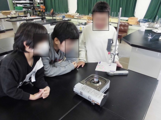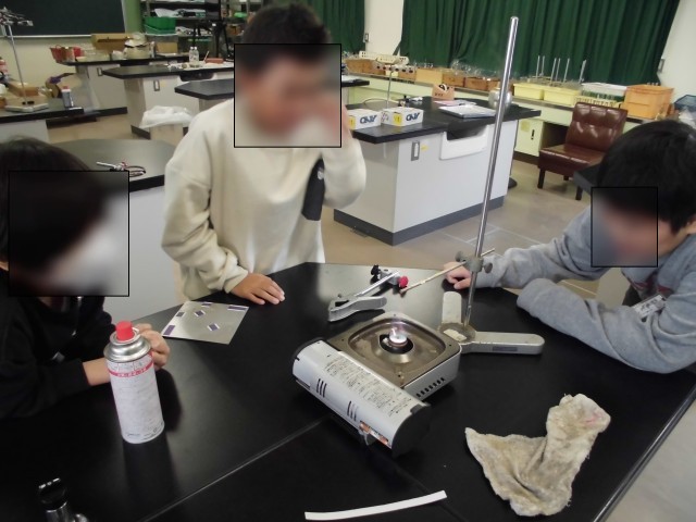 金属のあたたまりかたを調べています。どんな様子であたたまっていくのでしょう?興味津々で観察していました。