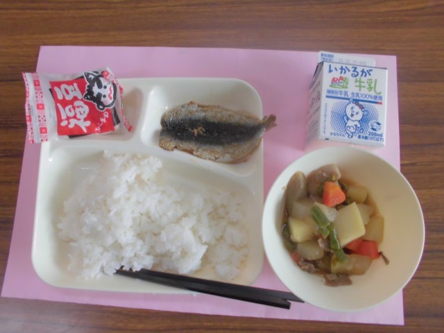 本日の献立は、「ごはん」「いわしのしょうがじょうゆかけ」「含め煮」「いり大豆」です。
