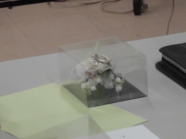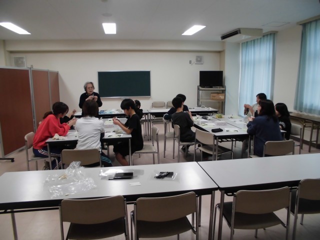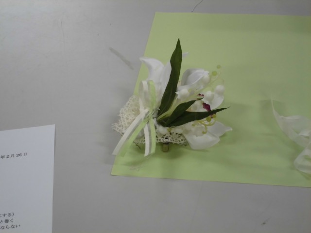 シンピジュウムというお花を中心にワイヤーやリボン、テープなどを使い1人ひとり綺麗に完成させることができました。