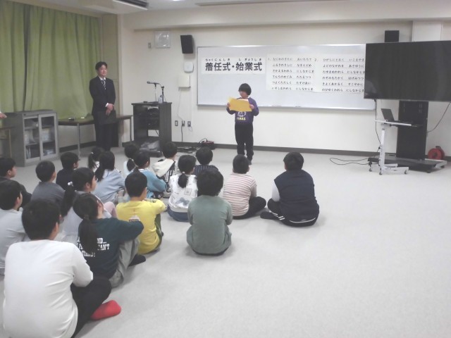 担任、教職員の発表を行い、6年生の代表児童が誓いのことばを述べました。「リーダーシップがとれる6年生になりたい!」と堂々と発表することができました。