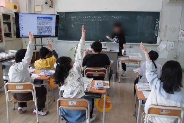 3年生では、新たに「社会」の学習が始まりました。主に、身近な地域や大阪市について、3年生は学習を深めます。意欲いっぱいに手を挙げる子どもたちの姿が印象的でした。