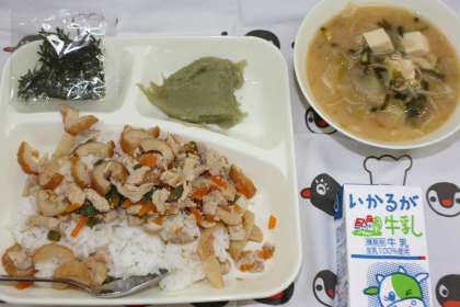 自校炊飯の設備がある校では、炊き込みご飯になりますが、本校では喫食時に混ぜ合わせて食べるスタイルです。