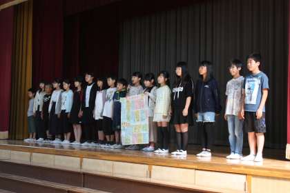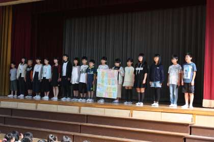 新聞委員会が児童集会で委員会の仕事について発表しました。