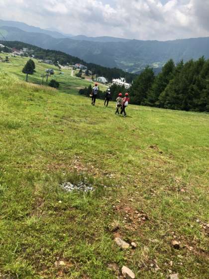 気持ちのよい緑の高原で、班活動(オリエンテーリング)をしています。