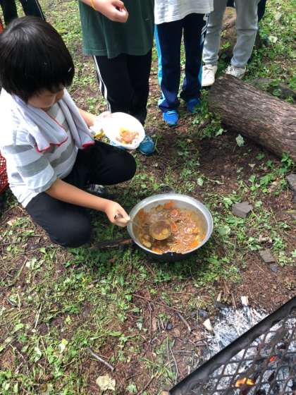 カレーの完成です。できばえは、みんなの笑顔を見ればわかります。