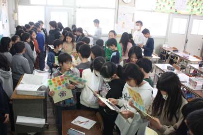 たてわり班で6年生への感謝に気持ちをこめて作ったメッセージカード代表で5年生が6年生の教室までわたしに行きました。