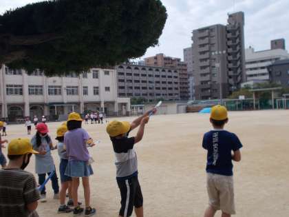 4年生は理科の実験で空気でっぽうを使ってやわらかい玉を飛ばしました。最初は3、4人ずつ、その後は先生に用意してもらった「まと」に当てたりして楽しみました。どうやったら遠くに飛ぶのかという問いには、子どもたちは、飛ばす向きや力の入れ方、風のない状況など様々な要因があることを考えていました。楽しみながらも空気のはたらきについて学習できました。