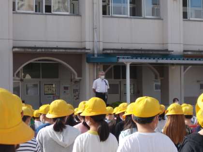 月曜日、久しぶりの運動場での児童朝会がありました。だいぶ秋らしい気候になってきましたね。みんなしっかり校長先生のお話を聞いています。
