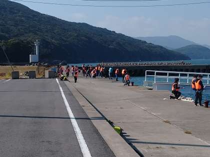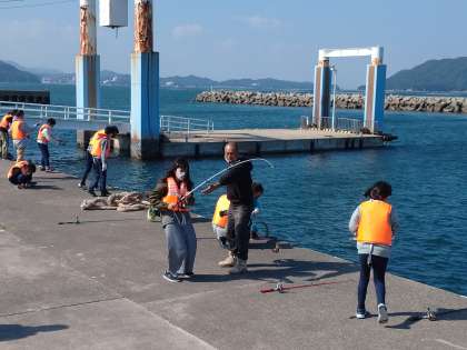 魚釣りチームは、用具の取り扱い、エサのつけかたを教わり、フィッシングスタートです。