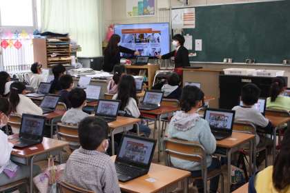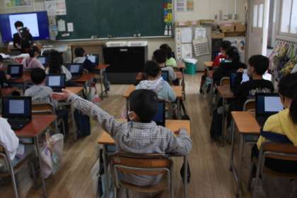 2年生から6年生において準備が整った学級から、新しく導入された一人一台学習者用端末の使用を始めています。