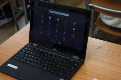 今回導入された端末は、タッチパネル機能があり、モニター部分を反対側に折り曲げてタブレットとしても使用できる機器です。
