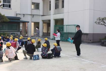 密を避けるために、運動場で組分けをしました。