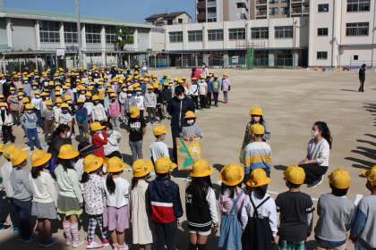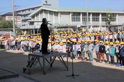朝会の隊形に並んだ上級生の前に、1年生103人が1列に並びました。
