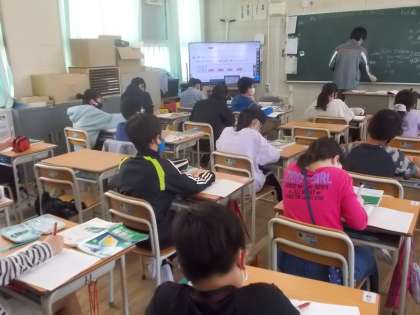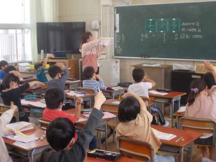 2年 国語 新出漢字の筆順をみんなで確かめています。