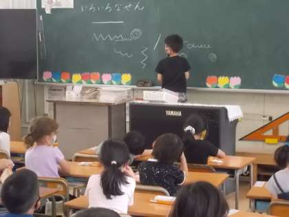 1年 図工 いろいろなせん 自分の紙にかいたり、みんなの前で発表したりしています。