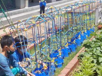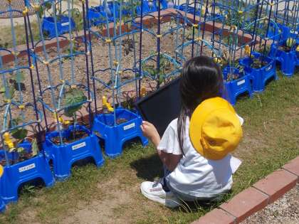 野菜を育てよう、タブレットによる写真記録も併用して成長の様子を観察しています。