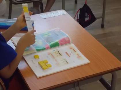たし算の問題場面を5のかたまりを作ることで考えています。ブロックを操作しながら考えることで、たし算のイメージ化を補助します。