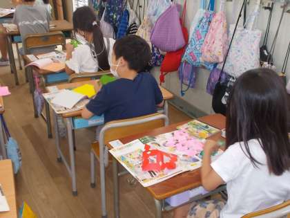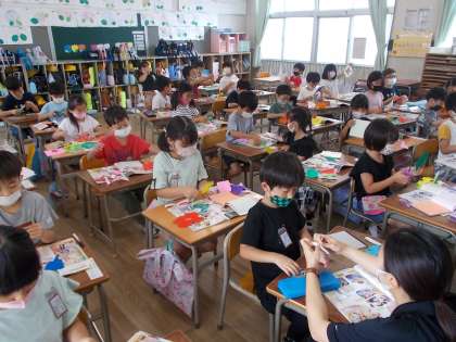 折り紙を折りたたんでから切ることでいろいろな形のかざりを作っています。