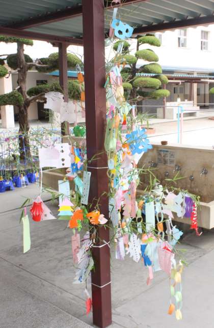 学校にある笹を管理作業員さんに切り出してもらい、1年生が笹かざりを作りました。