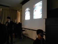 安全のため、保護眼鏡(ゴーグル)をして、距離を保ちながら実験をしています。