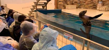 アシカショーの最前列は、水かぶり必至の特等席です。