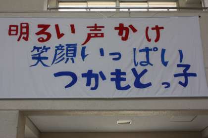 先日の「つかもとっ子会議」で話し合い、代表委員会の児童が大きな白布に書きました。