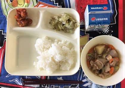 まぐろのオーロラ煮、豚肉と野菜の煮もの、キャベツの赤じそあえ、ごはん・牛乳