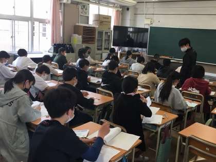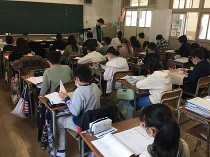 写真は、生活習慣や学習習慣に関する質問に答えているところです。