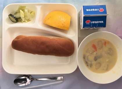 コーンクリームシチュー、キャベツときゅうりのサラダ、かわちばんかん、パン、牛乳