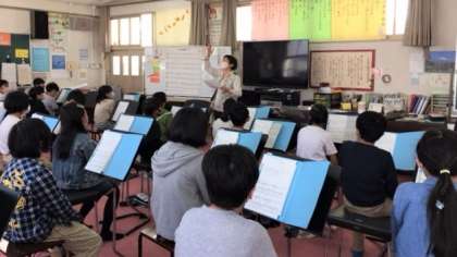 林間学習で歌う「燃えろよ燃えろ」を練習しました。歌声を響かせることを意識しました。