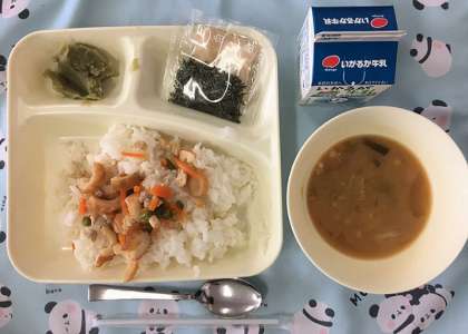 かやくご飯、きざみのり(袋)、じゃがいものみそ汁、まっ茶ういろう、きなこ(袋)、牛乳