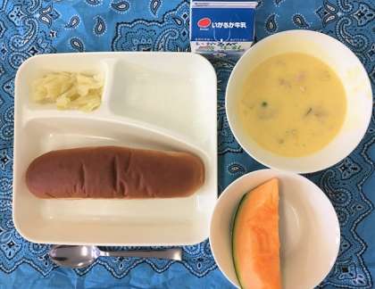 かぼちゃのクリームシチュー、キャベツのゆずドレッシング、クインシーメロン、黒糖パン、牛乳