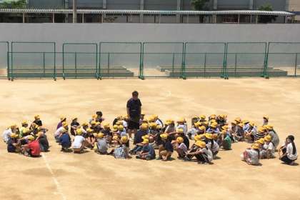運動場にいる児童は、落下物を避けるために、運動場のまん中に、