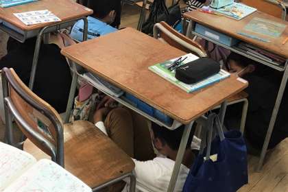 教室にいる児童は、机の下にもぐって、頭を守ります。